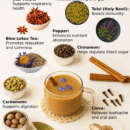 Blue Lotus Flower Tea, Cinnamon, Cardamom, Clove, Nutmeg, Pepper, Ginger, Fennel, Tulsi (Holy Basil), Star Anise.