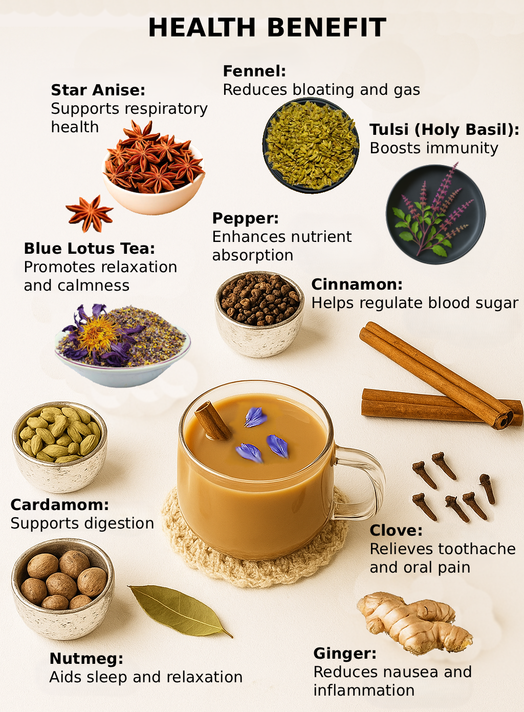 Blue Lotus Flower Tea, Cinnamon, Cardamom, Clove, Nutmeg, Pepper, Ginger, Fennel, Tulsi (Holy Basil), Star Anise.